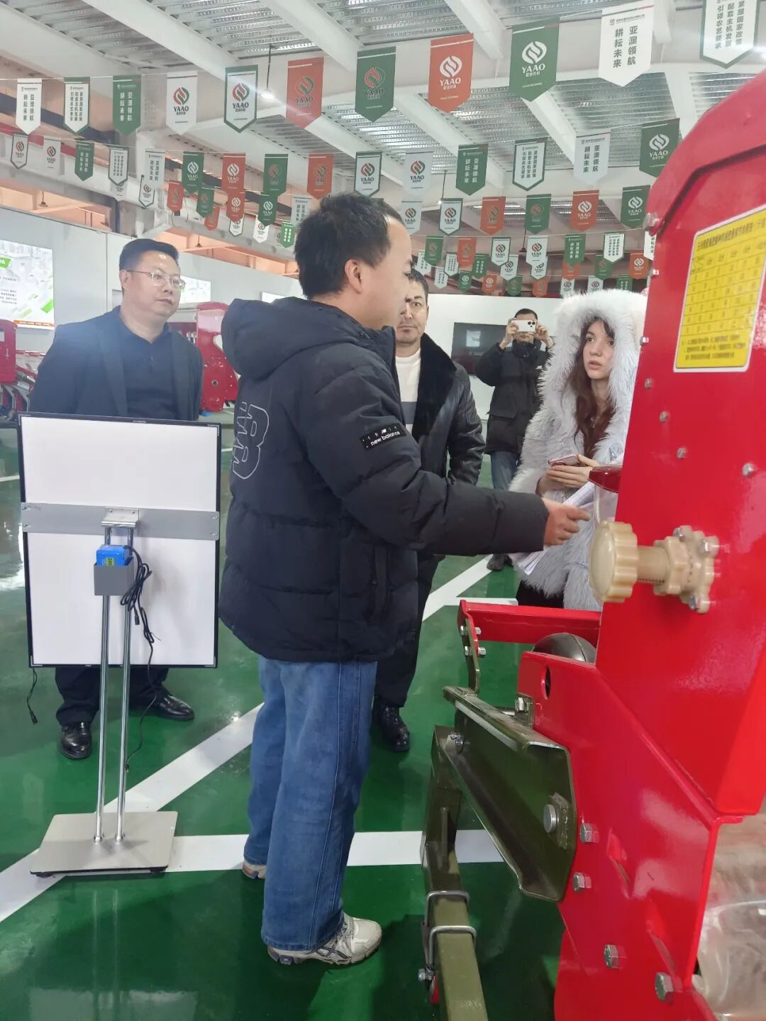 在產品展廳,亞澳農機負責外貿的時馳經理詳細介紹了公司的核心技術與產品優勢。針對代表團關注的氣吸式播種機,重點演示了其核心優勢:搭載進口指夾式排種器,播種精度高達95%以上,遠超國家標準;創新采用梯堵裝置等專利技術,可實現旋耕、整地、播種、施肥一體化作業,適配干旱與黏濕等多種土壤環境,且能根據需求定制雙苗帶機型,完全契合烏茲別克斯坦的棉花種植需求?!拔覀兊漠a品在國內小麥、玉米主產區可實現畝均增產10%-15%,作業成本降低30%以上,相信在烏茲別克斯坦也能發揮同樣的效益?!睍r馳經理的介紹讓代表團成員頻頻點頭。